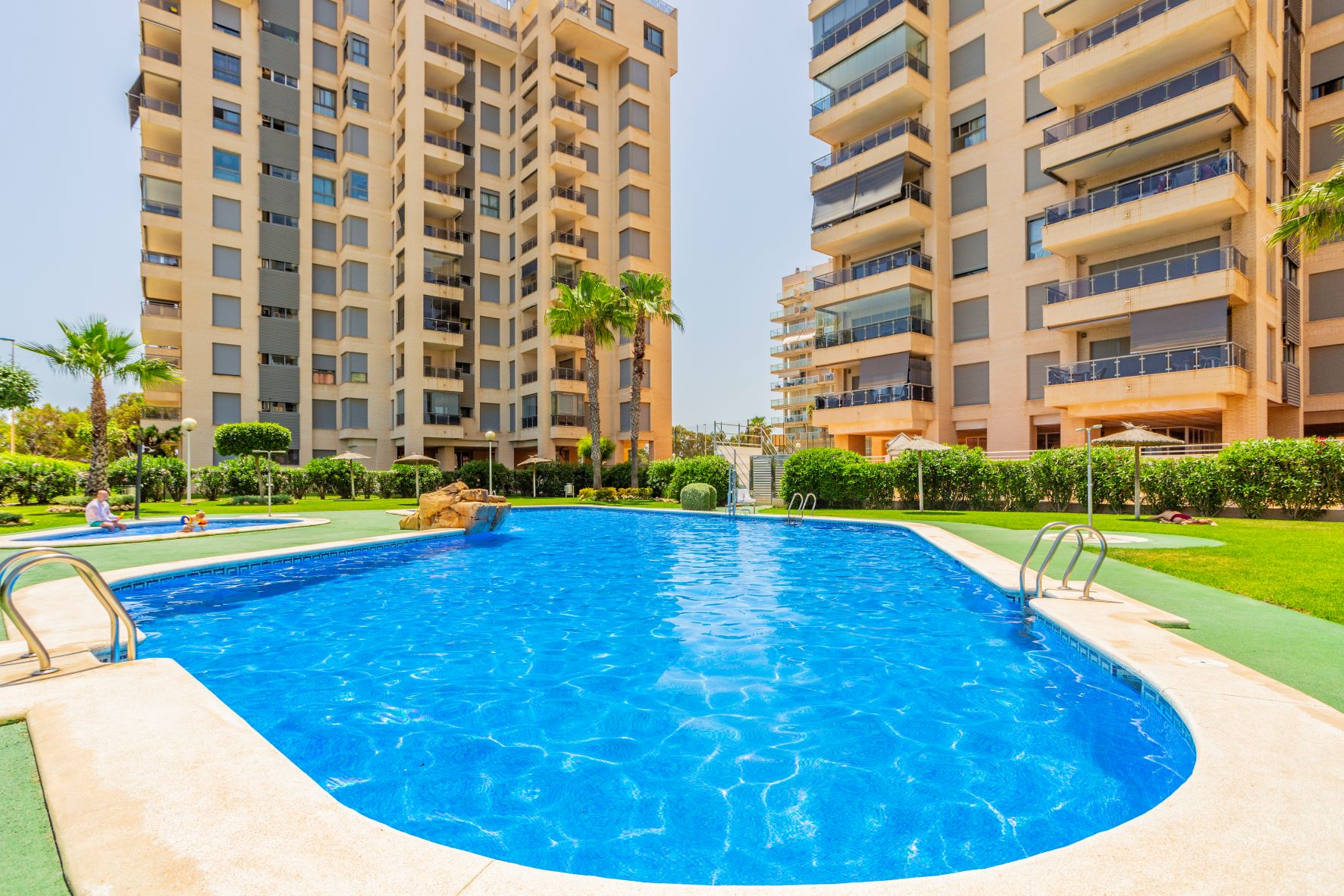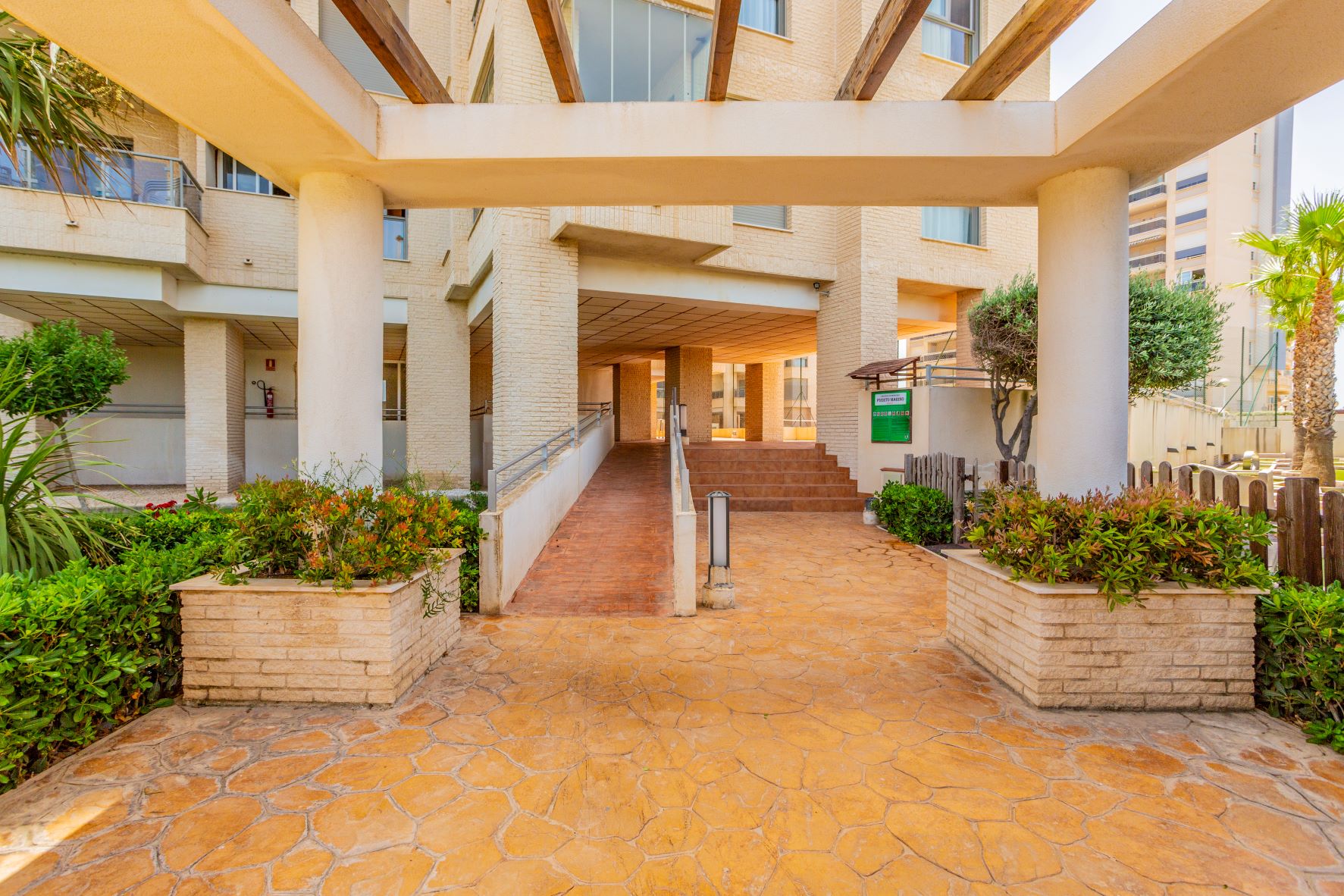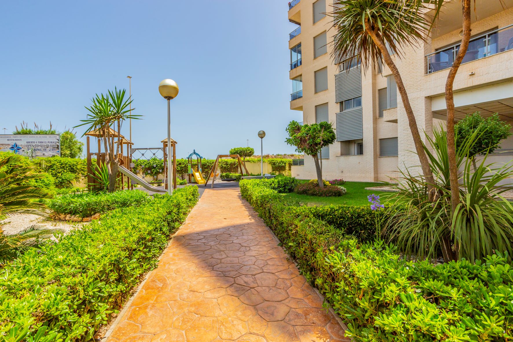 The apartment is located in a building with an elevator and consists of 3 bedrooms, 2 bathrooms (one en-suite), a living room, kitchen, dining area, and a terrace with stunning sea views.
