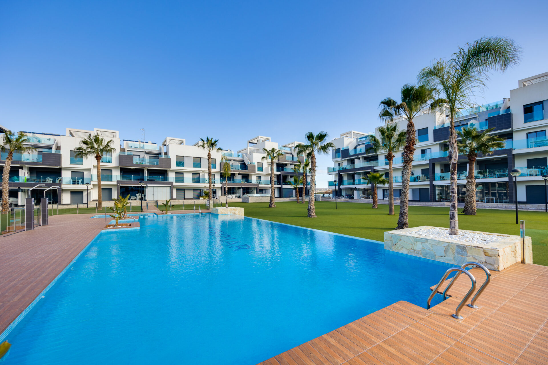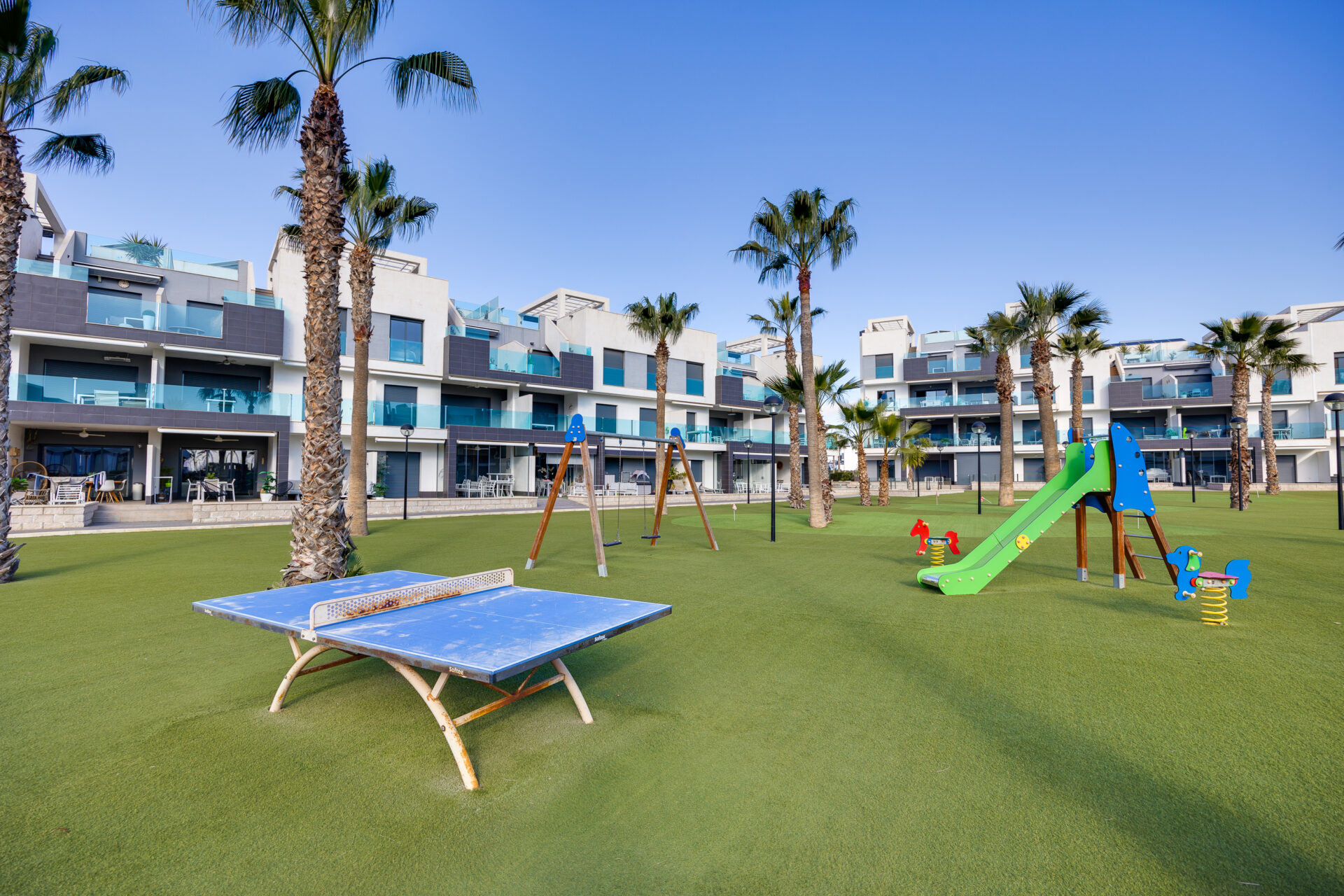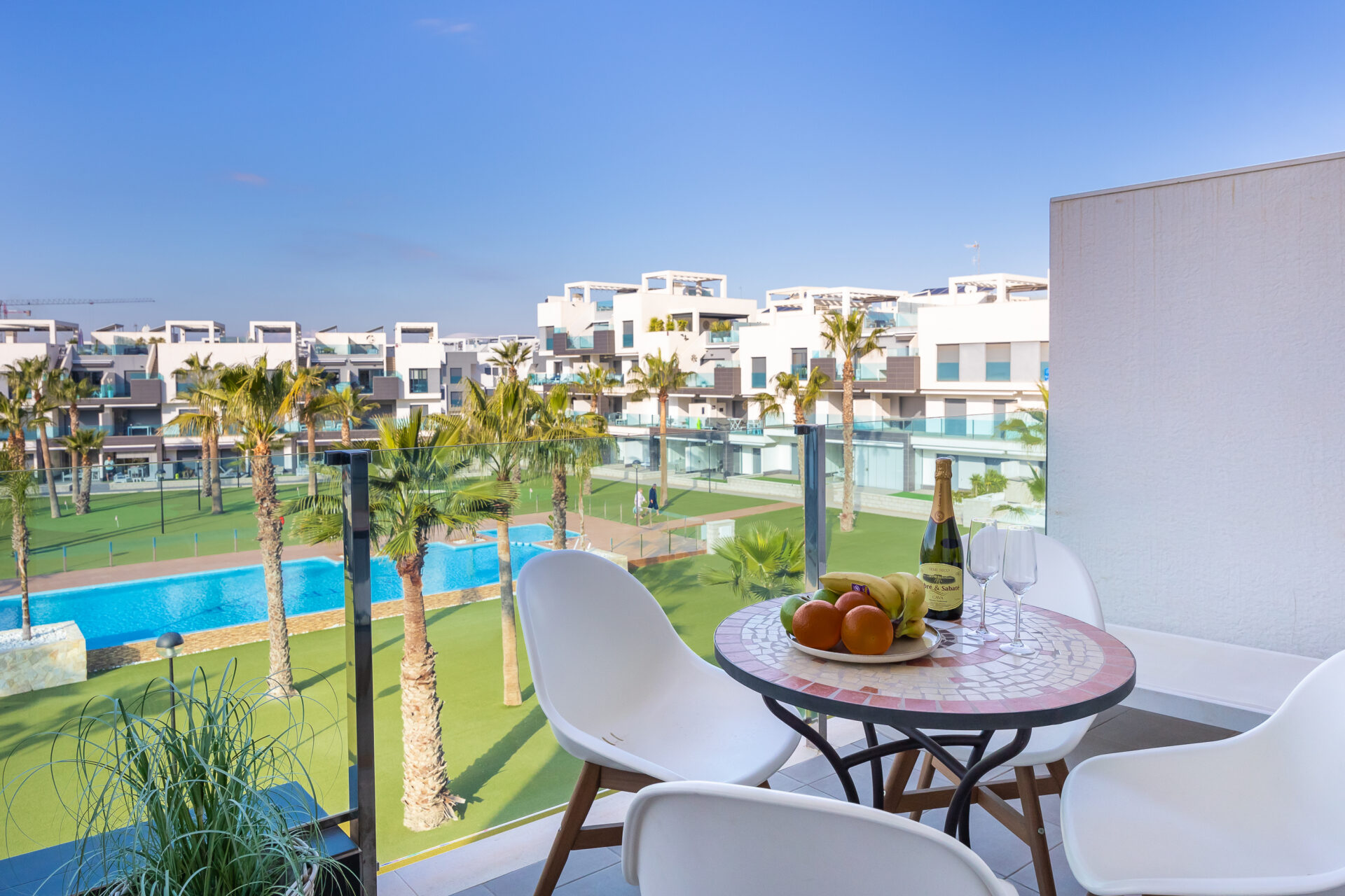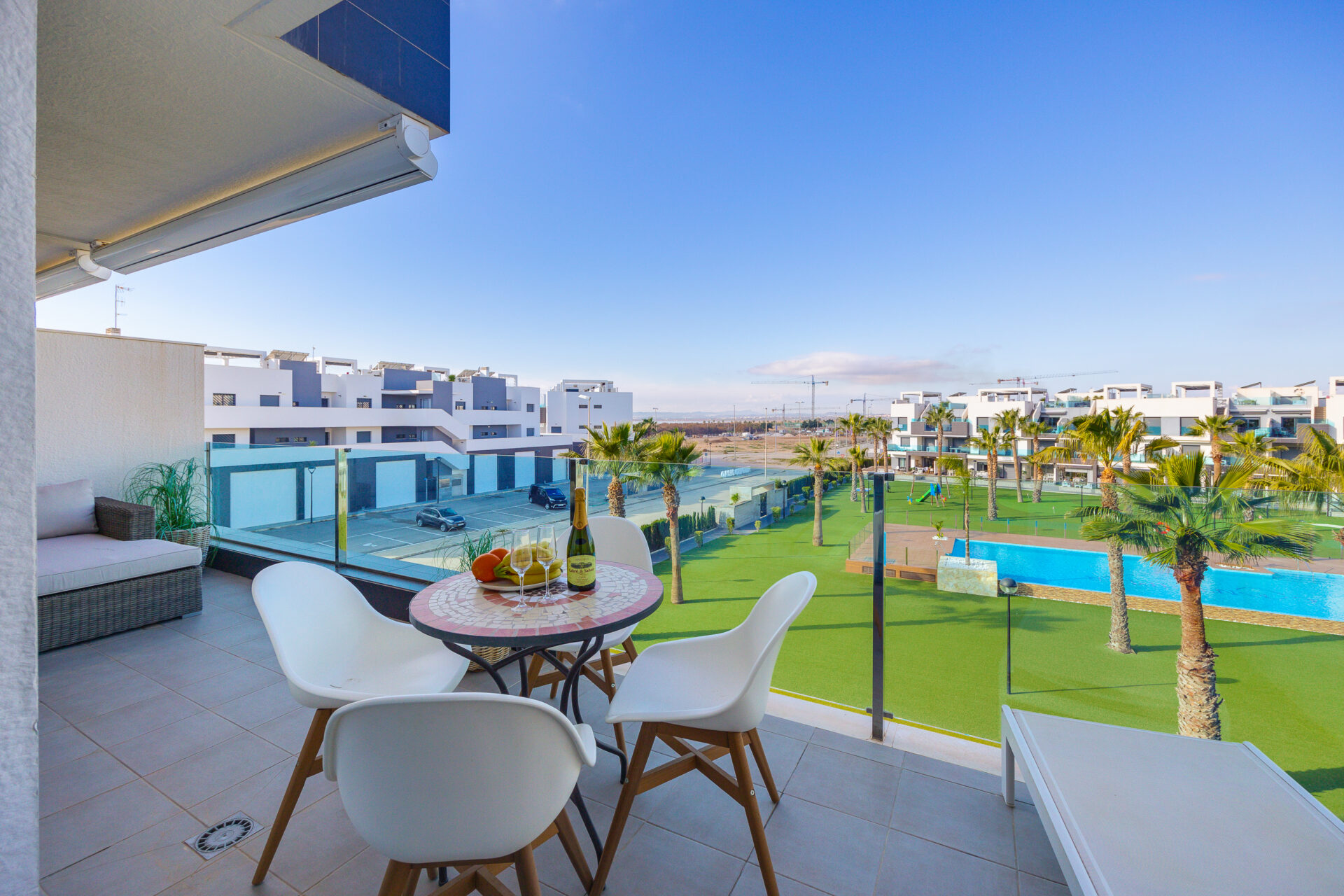 The apartment is located in Guardamar del Segura, Costa Blanca, Spain, within a secure gated complex in an international residential area, surrounded by orange groves.