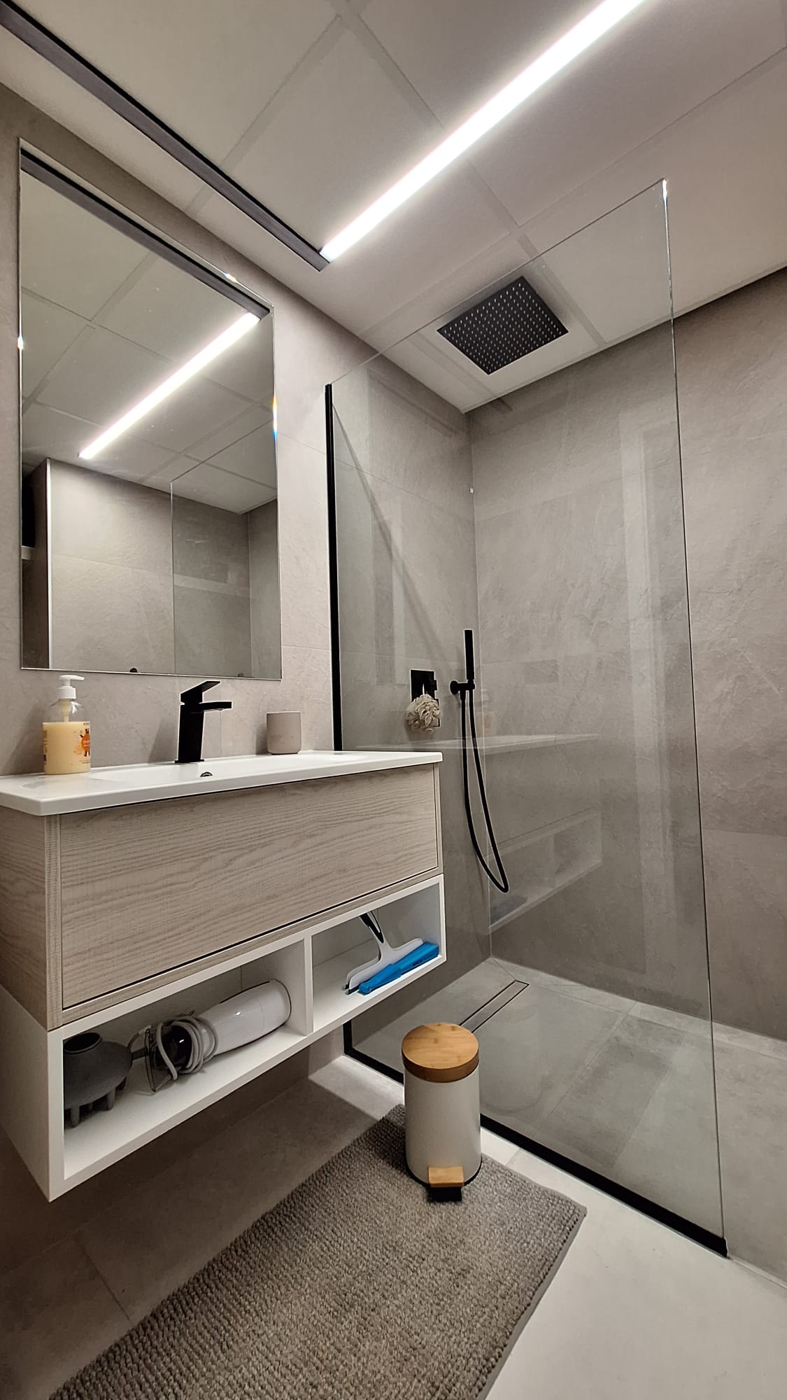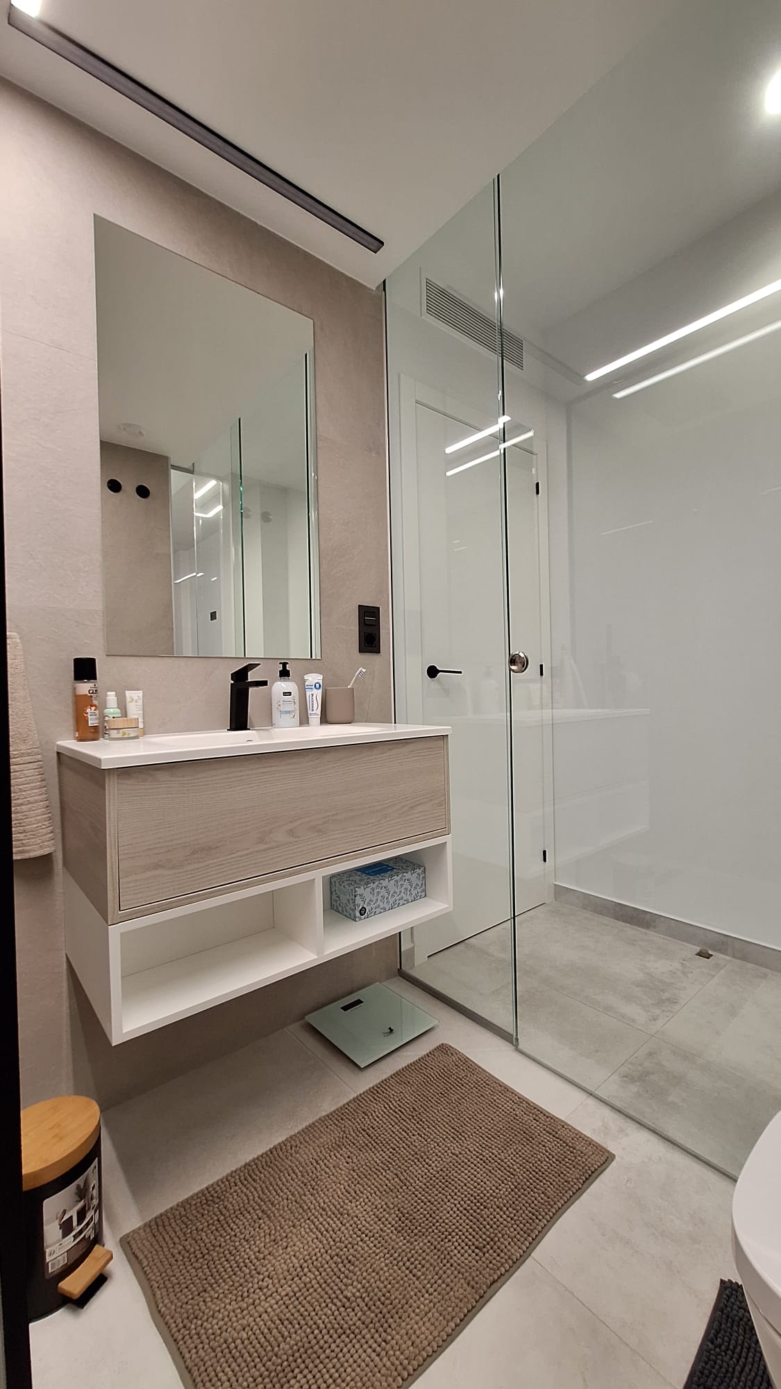 The apartment offers 2 bedrooms, 2 bathrooms, a fully equipped kitchen, a bright living room, a terrace, and a large private rooftop. The master bedroom includes an en-suite bathroom with a walk-in shower.